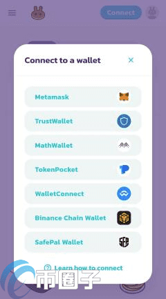 2、点击“Connect(连接钱包)”,选择你的钱包类型,支持Metamask、TrustWallet、MathWallet、SafePalWallet等多种钱包直接连接,也可以用带有WalletConnect的钱包连接,点击后,需要允许Pancakeswap访问你的钱包。
