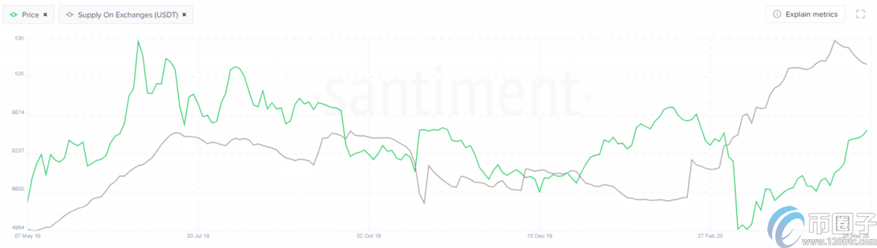 比特币价格——加密货币交易所持有USDT的比例图。 来源:Santiment