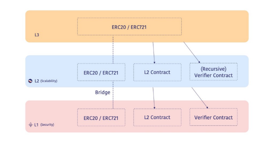 Layer3 如同 Layer2 嵌套在 Layer1上,它和 Layer2 之间也有着嵌套、递归的关系。通过递归证明的乘法效应,实现强大的可扩展性,同时这种扩容是呈几何级增长的,应用程序的设计者也能够更好地控制相关技术堆栈。通过自定义数据模型,加快区块链的技术周转率和功能运作效率。