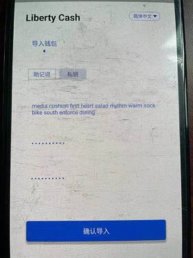 1、通过下载安装 LCS 钱包,打开首页是「导入钱包」,我们将一个测试助记词导入进去,点击确认导入。