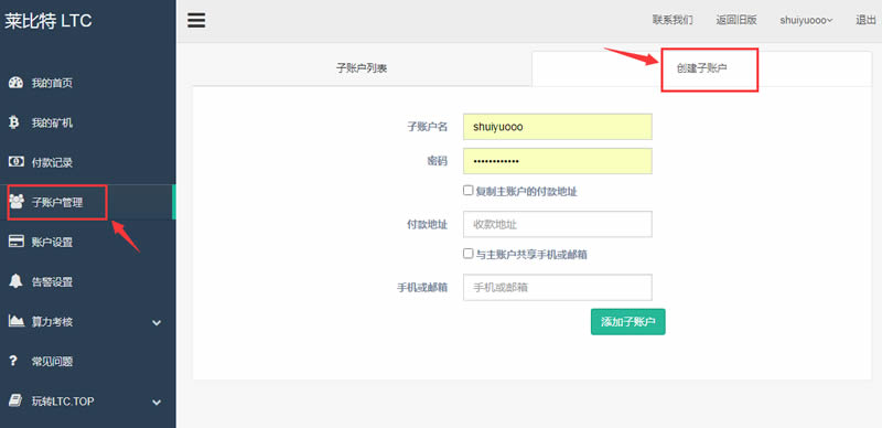 3、点击新增子账户,并根据页面要求,完成信息填写,点击创建