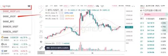 1.在左边搜索框,输入DOGE ,就是狗狗币的代码,这时候可以看到很多个交易对出来。