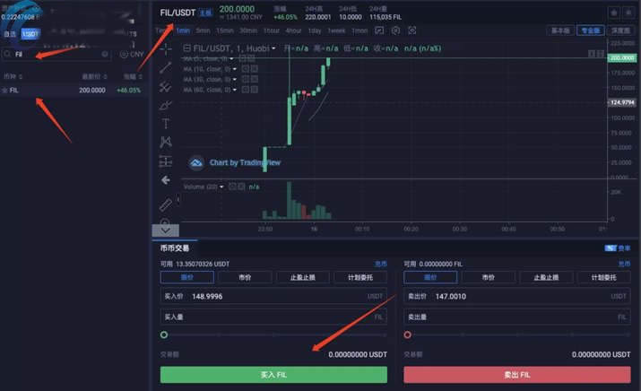然后点击Fil/USDT交易对,在里面就可以购买了,购买区域中,设置好购买的数量以及想要购买的价格,即可完成购买