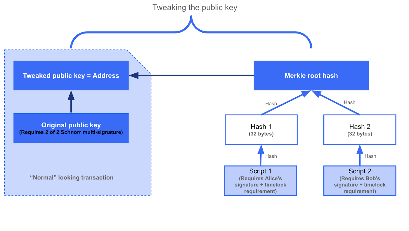 脚本模式:Alice和Bob,有一个拒绝签名,可以走脚本模式。此时Alice想要完成花费,那么见证脚本中需要填入:符合Script 1的执行数据D, Script 1, C, Hash 2 。为了验证签名,首先利用Script 1, Hash2,计算MerkleRoot,然后验证 P==C H(C||MerkleRoot)G 是否成立,**构建完整脚本D||Script 1并执行脚本,验证结果是否为真。当上述验证通过后,即可完成花费。