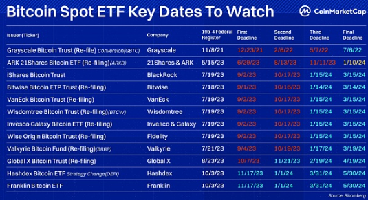 近两个月来的市场上涨行情,核心因素就是「现货比特币 ETF」预期的催动。其中从既定时间表来看,现货比特币 ETF 申请结果相距最近的时间节点是 2024 年 1 月 10 日:已经历经两次延迟的 ARK 21Shares Bitcoin ETF 将迎来**决定。除此之外,2024 年 1 月 14 日至 17 日,也密集有 7 家的现货比特币 ETF 申请将迎来美 SEC 做出决定的时间节点,不过按以往的惯例,大概率还要继续推迟到 3 月中旬的**时间窗口。
