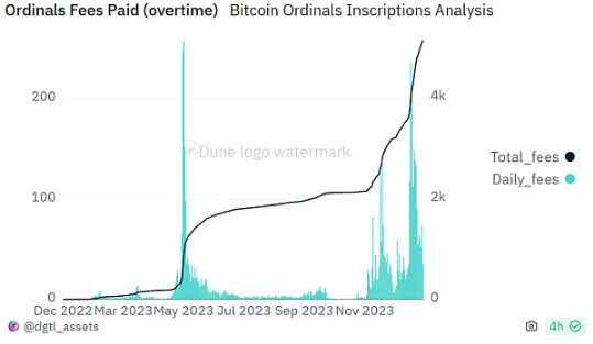 Dune **数据显示,截至 12 月 29 日,Ordinals 铭文铸造的累计费用超 5135 枚 BTC,超过 2 亿美元。这也助推 BTC 挖矿手续费收益创近 5 年来新高,此前矿工手续费收入的历史平均数据往往占比只有 2% 左右,而近三个月的平均数据却达到了约 8%,创下历史纪录。