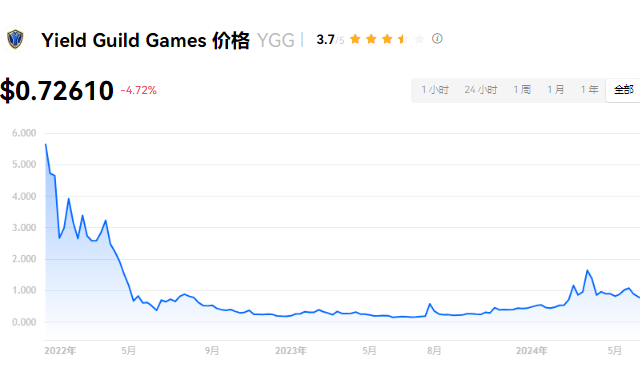 Yield Guild Games 当前价格为 $0.72610。Yield Guild Games 的价格在过去 24 小时内下跌了 -4.71%。目前,Yield Guild Games 市值排名为第 129 名,实时市值为 $2.70亿,流通供应量为 372,547,934 YGG,**供应量为 1,000,000,000 YGG。我们会实时更新 Yield Guild Games/USD 的价格。Yield Guild Games 价格表现 (美元)