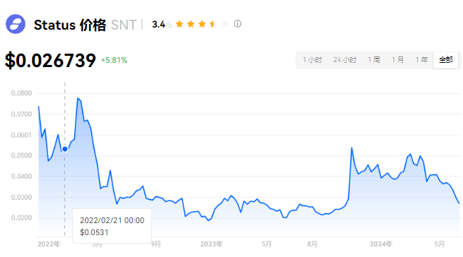 Status 当前价格为 $0.026739。Status 的价格在过去 24 小时内上涨了 5.82%。目前,Status 市值排名为第 180 名,实时市值为 $1.06亿,流通供应量为 3,960,483,788 SNT,**供应量为 6,804,870,174 SNT。我们会实时更新 Status/USD 的价格。Status 价格表现 (美元)