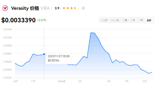 Verasity 当前价格为 $0.0033390。Verasity 的价格在过去 24 小时内上涨了 2.68%。目前,Verasity 市值排名为第 234 名,实时市值为 $3,320.46万,流通供应量为 10,001,381,139 VRA,**供应量为 99,001,381,139 VRA。我们会实时更新 Verasity/USD 的价格。Verasity 价格表现 (美元)