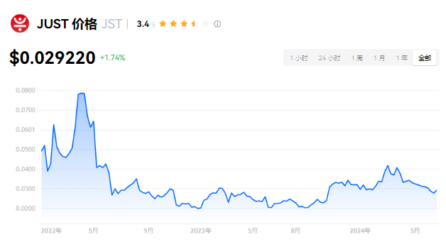 JUST 当前价格为 $0.029220。JUST 的价格在过去 24 小时内上涨了 1.74%。目前,JUST 市值排名为第 115 名,实时市值为 $2.89亿,流通供应量为 9,900,000,000 JST,**供应量为 9,900,000,000 JST。我们会实时更新 JUST/USD 的价格。JUST 价格表现 (美元)