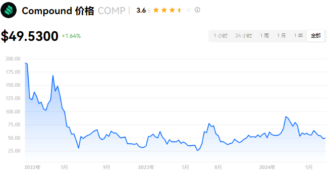 Compound 当前价格为 $49.5300。Compound 的价格在过去 24 小时内上涨了 1.64%。目前,Compound 市值排名为第 106 名,实时市值为 $3.40亿,流通供应量为 6,856,086 COMP,**供应量为 10,000,000 COMP。我们会实时更新 Compound/USD 的价格。Compound 价格表现 (美元)