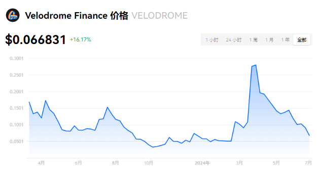 Velodrome Finance 当前价格为 $0.066831。Velodrome Finance 的价格在过去 24 小时内上涨了 16.17%。目前,Velodrome Finance 市值排名为第 207 名,实时市值为 $4,810.66万,流通供应量为 724,496,332 VELODROME,**供应量为 1,731,271,760 VELODROME。我们会实时更新 Velodrome Finance/USD 的价格。Velodrome Finance 价格表现 (美元)