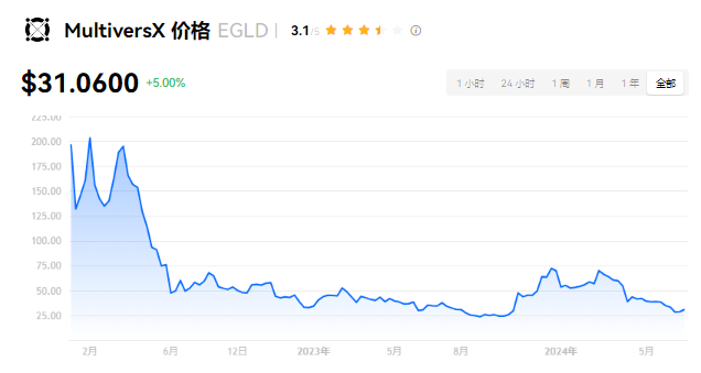 MultiversX 当前价格为 $31.0600。MultiversX 的价格在过去 24 小时内上涨了 5.00%。目前,MultiversX 市值排名为第 57 名,实时市值为 $8.41亿,流通供应量为 27,144,255 EGLD,**供应量为 31,415,926 EGLD。我们会实时更新 MultiversX/USD 的价格。MultiversX 价格表现 (美元)