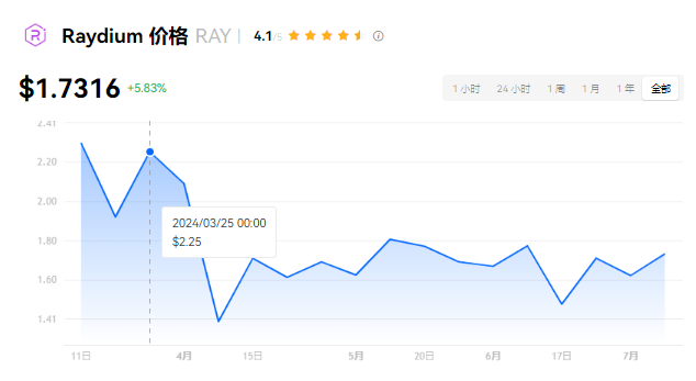 Raydium 当前价格为 $1.7316。Raydium 的价格在过去 24 小时内上涨了 5.84%。目前,Raydium 市值排名为第 85 名,实时市值为 $4.57亿,流通供应量为 262,948,379 RAY,**供应量为 555,000,000 RAY。我们会实时更新 Raydium/USD 的价格。Raydium 价格表现 (美元)