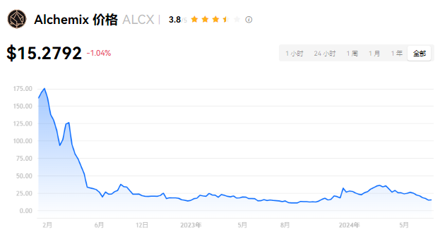 Alchemix 当前价格为 $15.2792。Alchemix 的价格在过去 24 小时内下跌了 -1.04%。目前,Alchemix 市值排名为第 224 名,实时市值为 $3,471.84万,流通供应量为 2,273,638 ALCX,**供应量为 2,932,323 ALCX。我们会实时更新 Alchemix/USD 的价格。Alchemix 价格表现 (美元)