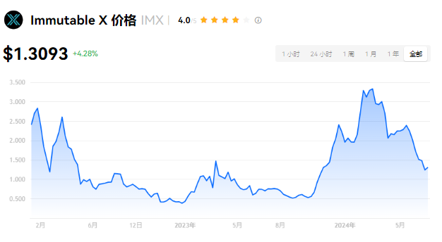Immutable X 当前价格为 $1.3093。Immutable X 的价格在过去 24 小时内上涨了 4.29%。目前,Immutable X 市值排名为第 39 名,实时市值为 $19.80亿,流通供应量为 1,507,875,589 IMX,**供应量为 2,000,000,000 IMX。我们会实时更新 Immutable X/USD 的价格。Immutable X 价格表现 (美元)