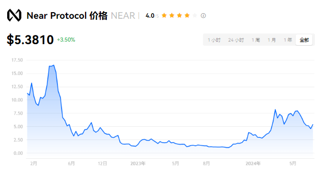 Near Protocol 当前价格为 $5.3810。Near Protocol 的价格在过去 24 小时内上涨了 3.50%。目前,Near Protocol 市值排名为第 20 名,实时市值为 $59.17亿,流通供应量为 1,101,812,375 NEAR,**供应量为 1,183,246,171 NEAR。我们会实时更新 Near Protocol/USD 的价格。Near Protocol 价格表现 (美元)