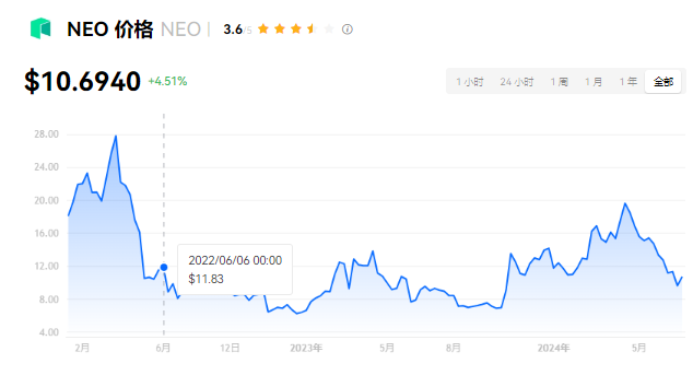 NEO 当前价格为 $10.6940。NEO 的价格在过去 24 小时内上涨了 4.52%。目前,NEO 市值排名为第 67 名,实时市值为 $7.54亿,流通供应量为 70,530,000 NEO,**供应量为 100,000,000 NEO。我们会实时更新 NEO/USD 的价格。NEO 价格表现 (美元)