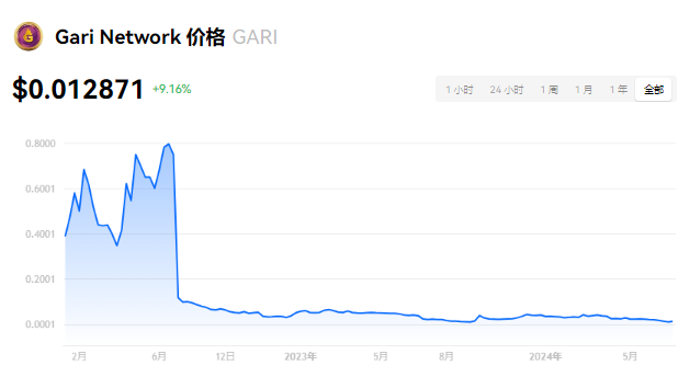 Gari Network 当前价格为 $0.012871。Gari Network 的价格在过去 24 小时内上涨了 9.17%。目前,Gari Network 市值排名为第 263 名,实时市值为 $635.73万,流通供应量为 494,350,601 GARI,**供应量为 986,395,418 GARI。我们会实时更新 Gari Network/USD 的价格。Gari Network 价格表现 (美元)