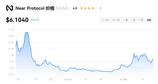 Near Protocol 当前价格为 $6.1040。Near Protocol 的价格在过去 24 小时内上涨了 9.41%。目前,Near Protocol 市值排名为第 19 名,实时市值为 $67.20亿,流通供应量为 1,102,340,023 NEAR,**供应量为 1,183,246,171 NEAR。我们会实时更新 Near Protocol/USD 的价格。Near Protocol 价格表现 (美元)