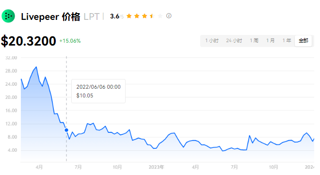 Livepeer 当前价格为 $20.3200。Livepeer 的价格在过去 24 小时内上涨了 15.06%。目前,Livepeer 市值排名为第 81 名,实时市值为 $6.57亿,流通供应量为 32,267,784 LPT,**供应量为 32,267,784 LPT。我们会实时更新 Livepeer/USD 的价格。Livepeer 价格表现 (美元)