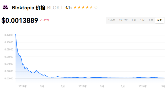 Bloktopia 当前价格为 $0.0013889。Bloktopia 的价格在过去 24 小时内下跌了 -1.42%。目前,Bloktopia 市值排名为第 258 名,实时市值为 $1,158.25万,流通供应量为 8,338,704,276 BLOK,**供应量为 200,000,000,000 BLOK。我们会实时更新 Bloktopia/USD 的价格。Bloktopia 价格表现 (美元)