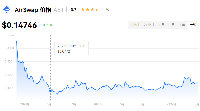 AirSwap 当前价格为 $0.14746。AirSwap 的价格在过去 24 小时内上涨了 10.91%。目前,AirSwap 市值排名为第 241 名,实时市值为 $3,007.45万,流通供应量为 204,033,492 AST,**供应量为 500,000,000 AST。我们会实时更新 AirSwap/USD 的价格。AirSwap 价格表现 (美元)