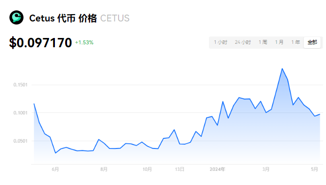 Cetus ** 当前价格为 $0.097170。Cetus ** 的价格在过去 24 小时内上涨了 1.54%。目前,Cetus ** 市值排名为第 240 名,实时市值为 $3,098.03万,流通供应量为 319,285,581 CETUS,**供应量为 1,000,000,000 CETUS。我们会实时更新 Cetus **/USD 的价格。Cetus ** 价格表现 (美元)