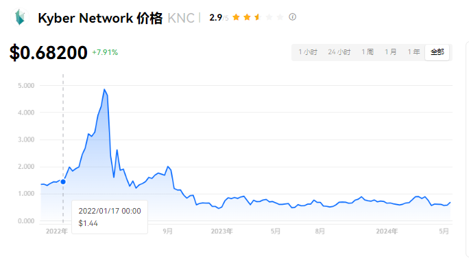 Kyber Network 当前价格为 $0.68200。Kyber Network 的价格在过去 24 小时内上涨了 7.91%。目前,Kyber Network 市值排名为第 191 名,实时市值为 $1.16亿,流通供应量为 170,152,851 KNC,**供应量为 252,301,550 KNC。我们会实时更新 Kyber Network/USD 的价格。Kyber Network 价格表现 (美元)