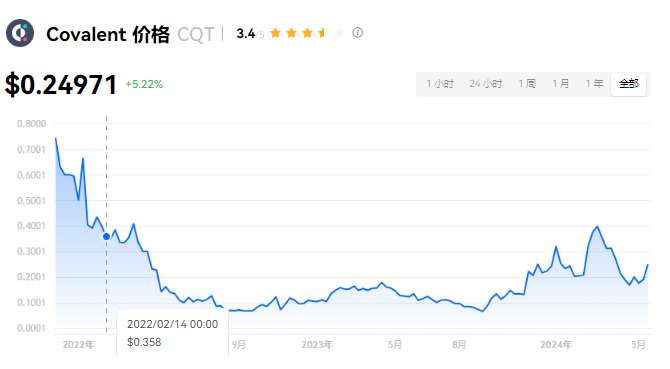 Covalent 当前价格为 $0.24971。Covalent 的价格在过去 24 小时内上涨了 5.22%。目前,Covalent 市值排名为第 170 名,实时市值为 $1.58亿,流通供应量为 634,051,477 CQT,**供应量为 1,000,000,000 CQT。我们会实时更新 Covalent/USD 的价格。Covalent 价格表现 (美元)