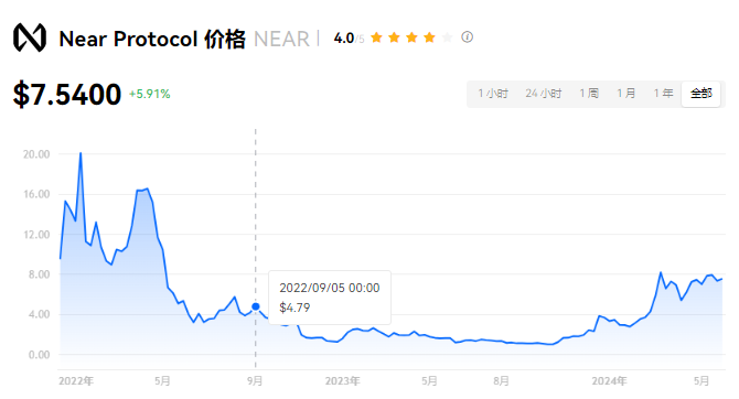 Near Protocol 当前价格为 $7.5400。Near Protocol 的价格在过去 24 小时内上涨了 5.91%。目前,Near Protocol 市值排名为第 20 名,实时市值为 $81.73亿,流通供应量为 1,082,387,430 NEAR,**供应量为 1,183,246,171 NEAR。我们会实时更新 Near Protocol/USD 的价格。Near Protocol 价格表现 (美元)