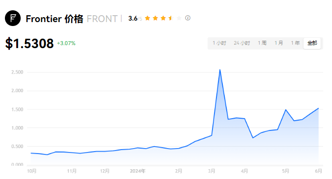 Frontier 当前价格为 $1.5308。Frontier 的价格在过去 24 小时内上涨了 3.08%。目前,Frontier 市值排名为第 183 名,实时市值为 $1.34亿,流通供应量为 87,456,250 FRONT,**供应量为 90,000,000 FRONT。我们会实时更新 Frontier/USD 的价格。Frontier 价格表现 (美元)