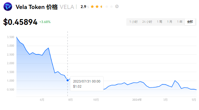 Vela Token 当前价格为 $0.45894。Vela Token 的价格在过去 24 小时内上涨了 3.68%。目前,Vela Token 市值排名为第 271 名,实时市值为 $934.22万,流通供应量为 20,348,919 VELA,**供应量为 50,000,000 VELA。我们会实时更新 Vela Token/USD 的价格。Vela Token 价格表现 (美元)