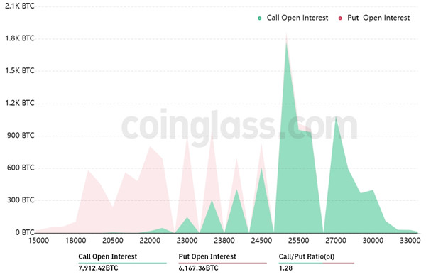 在 23,000 美元到 25,000 美元之间: 940 个看涨期权与 1,360 个看跌期权。**结果在多头和空头之间保持平衡。