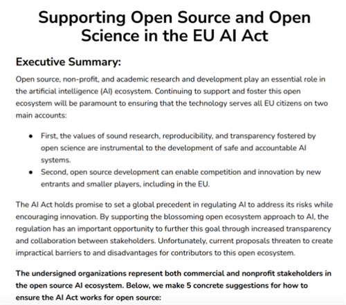 特别是,该小组提出了五项建议,以确保《人工智能法案》适用于开源模型,包括明确定义人工智能组件、澄清开源模型的协作开发不会使开发人员受到法案要求的约束、通过以下方式确保研究人员的例外:允许在现实条件下进行有限的测试,并为“基础模型”设定比例要求。