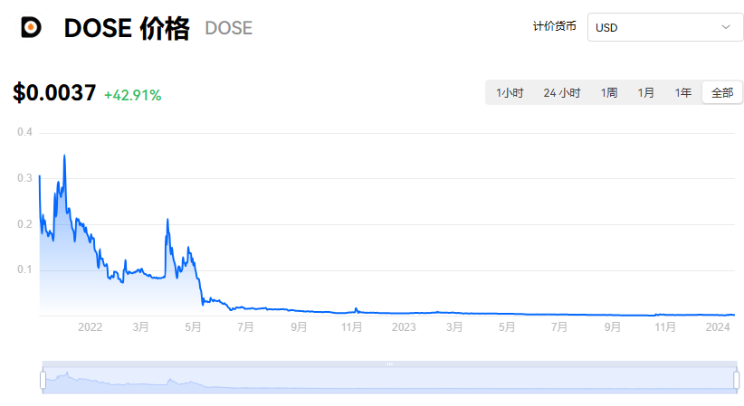 DOSE 当前价格为 $0.0037。DOSE 的价格在过去 24 小时内上涨了 42.91%。目前,DOSE 市值排名为第 1564 名,实时市值为 $500.54万,流通供应量为 13.75亿 DOSE,**供应量为 50.00亿 DOSE。我们会实时更新 DOSE/USD 的价格。DOSE 价格表现 (美元)