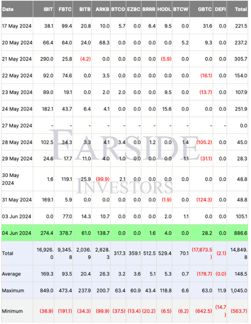 据初步数据显示,美国的现货比特币交易所交易基金(ETFs)在6月6日迎来了资金净流入的小**,达到了8.866亿美元的规模,创下近期第二高的单日净流入记录。