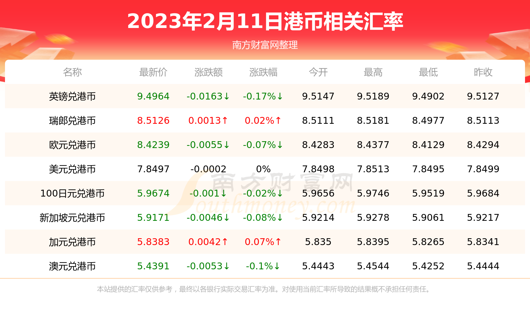 2023年2月11日港币相关汇率查询