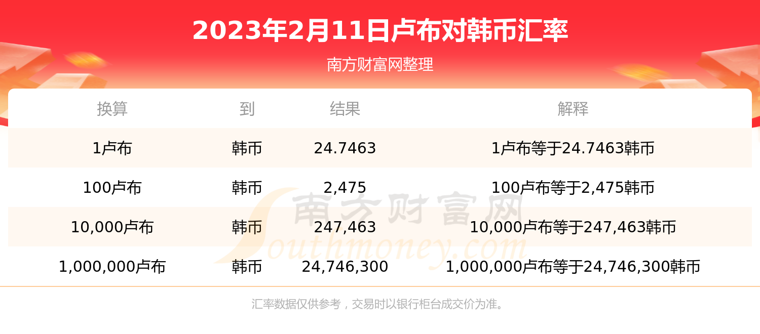 卢布兑换韩币汇率今日查询(2023年2月11日)