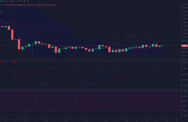 四小时图上,布林带开口向上,价格保持在中上轨区域运行,日内上行测试受阻于上轨位置附近,KDJ三线下行趋势趋缓走平,MACD指标快慢线平行上行,阳极柱能量趋于萎缩,RSI指标在合理区域上行,上方10500位置附近压制依然较强,多头上行趋势开始减弱。所以建议短期区间增加/[/K0/。