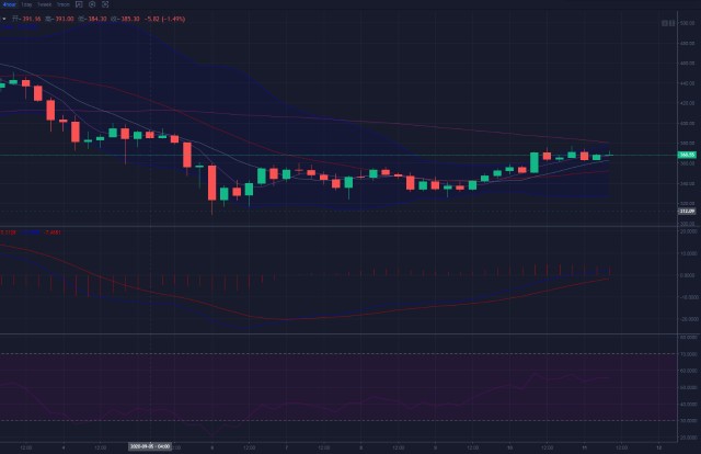 四小时图上,布林带一直向上开口,上方空空间**打开。价格保持在中上轨区域,均线呈多头排列。价格开始站稳五日均线,日内行情将大概率回到370区域。KDJ三线有向下发散迹象,MACD指标金超快慢线正柱能量从向上方向收缩。RSI指标在合理区域拐头向上,整体趋势是上升趋势,上方压制关注380位置附近,下方支撑关注350位置。