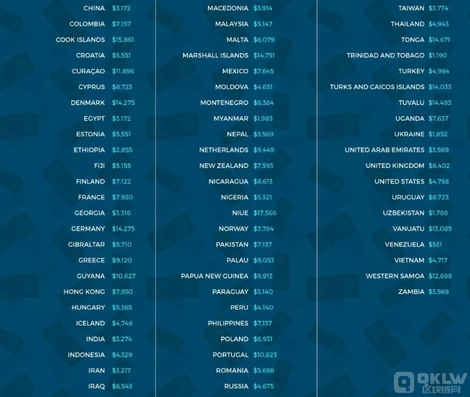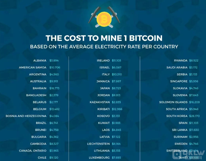 美国Crescent电力供应公司的一家子公司Elite Fixtures ,曾根据政府数据、公用事业公司数据以及IEA、EIA、OANDA等机构的世界报告,以平均电价为基础,研究了在115个**每开采1枚比特币所花费的成本(此项研究是基于2018年年初时的开采难度以及蚂蚁矿机S9、蚂蚁矿机S7、阿瓦隆6的电力消耗进行计算得出的)。