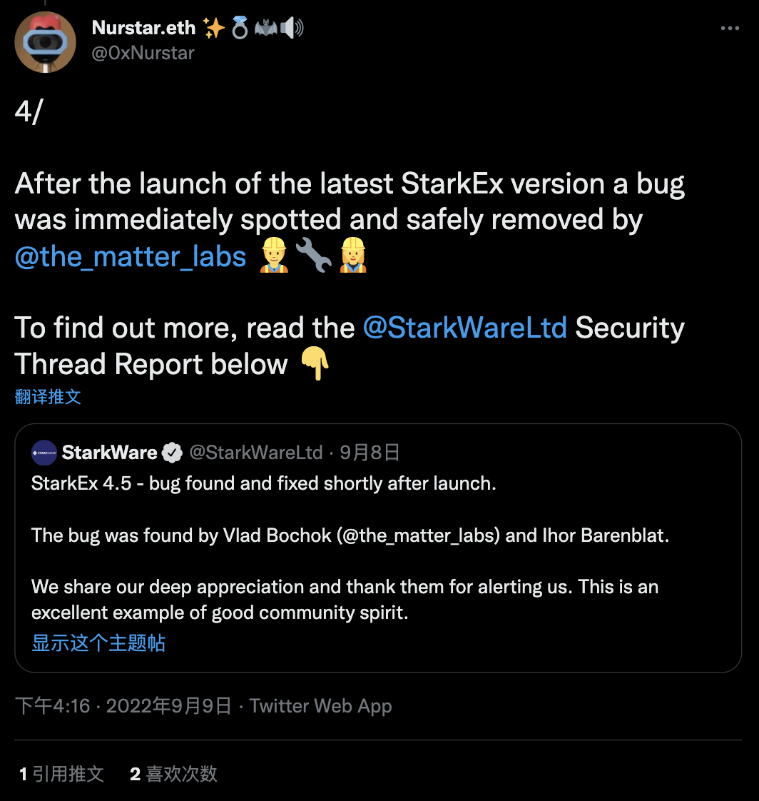 还记得最近发生的 StarkEx 漏洞利用事件吗?该问题**由 StarkNet 的直接竞争对手 zkSync 解决(在 StarkEx **版本发布后,Matter Labs 立即修复了一个被发现的漏洞。欲了解更多信息,请阅读 StarkWareLtd 安全性 报告。)
