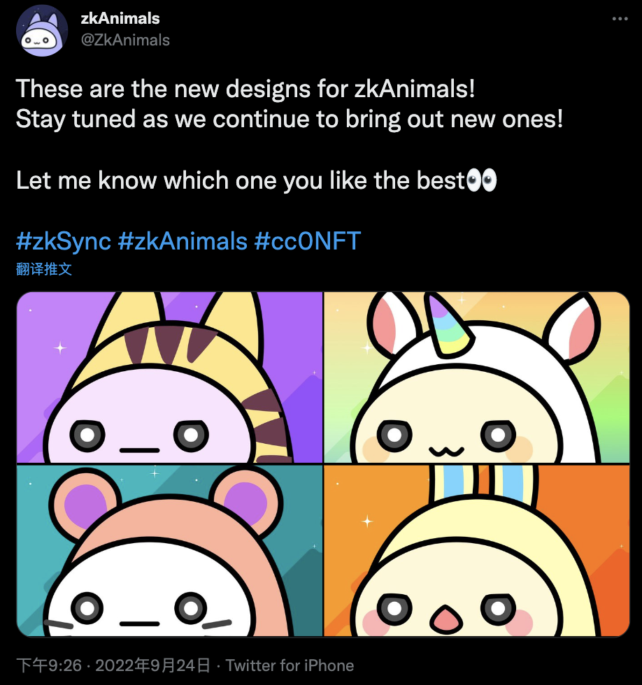 CC0 NFT ZkAnimals,一共 3000 只动物 NFT。其目标是帮助zkSync生态公**品融资,铸币收益的确切分配方式尚未确定。