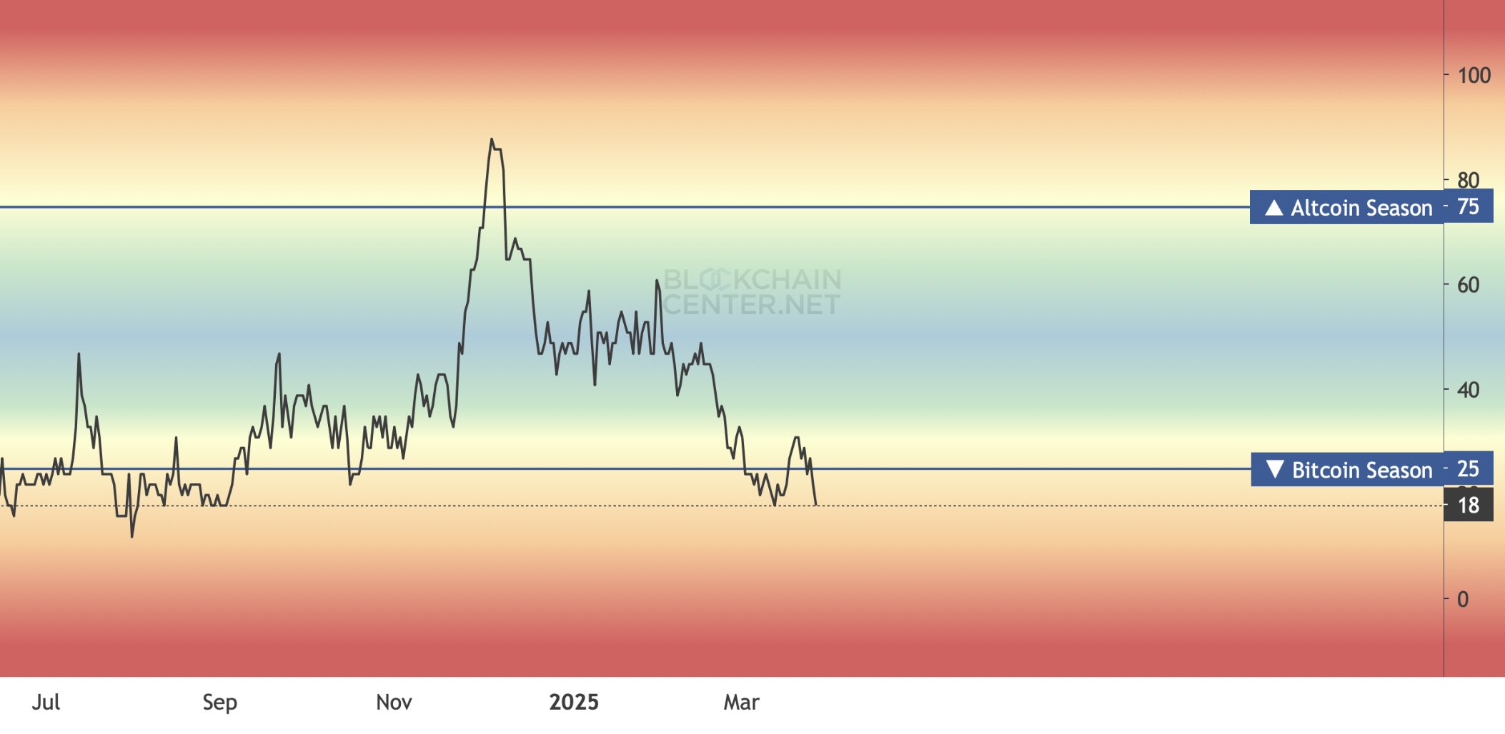 加密分析师斯蒂芬(Steph)通过分析Altcoin和比特币的市场周期,提出了一种简单而有效的财富积累方法。他的策略主要围绕着如何在合适的时间买卖XRP,根据BlockchainCenter的比特币和Altcoin季节指数来进行操作。当前,该指数为18,表明比特币季节强势,这在历史上通常对山寨币不利。