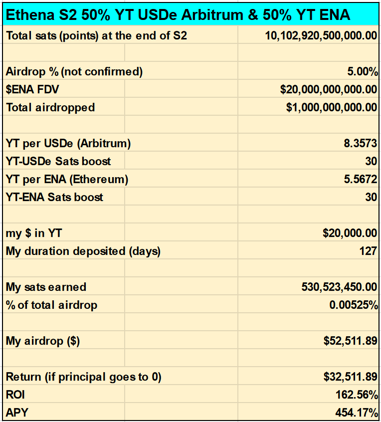 为什么要如此复杂性? 因为每个钱包锁定ENA至少占其USDe总持有量50%的用户将获得50%的奖励。通过将YT-ENA和YT-USDe放在同一个钱包中,可以将两个池中的 YT-USDe 总奖励将增加 50%。