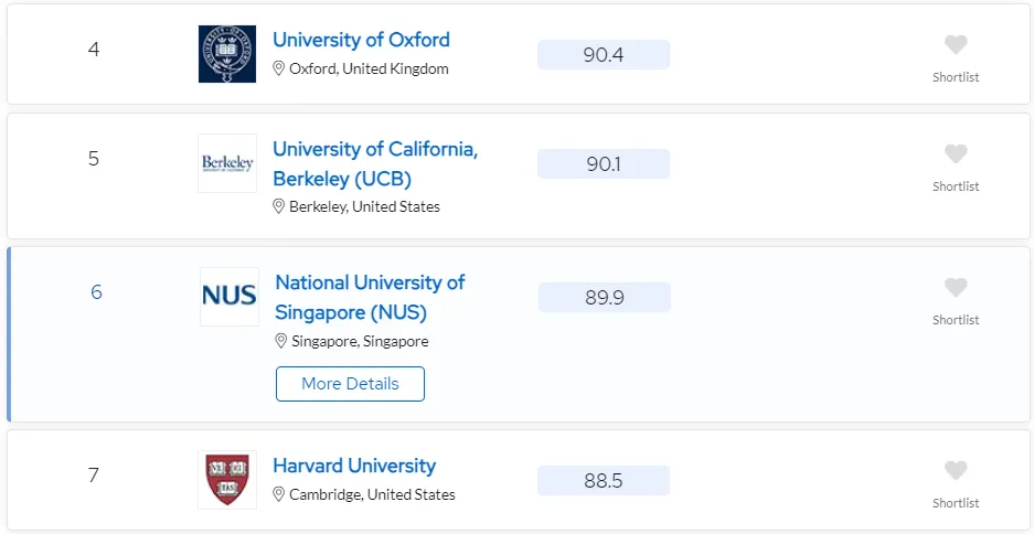 后续排名如下图所示,分别是:牛津大学、UC伯克利、新加坡国立大学、哈佛大学、剑桥大学、苏黎世联邦理工大学、南洋理工大学。