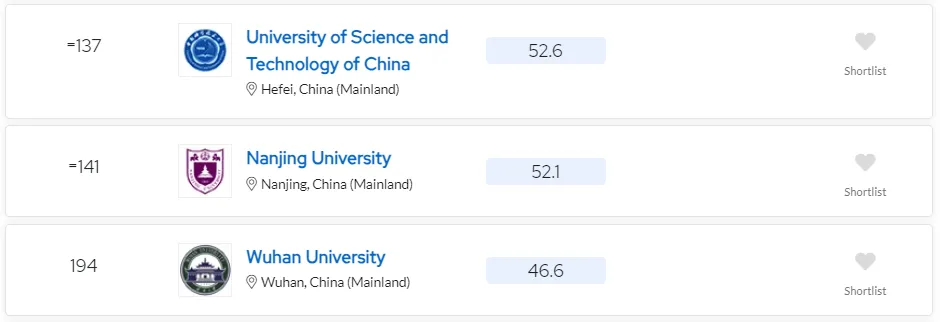 前一百名内,后续还有上海交通大学(27名)、浙江大学(29名)、复旦大学(40名)、**科学技术大学(并列69名)、哈尔滨工业大学(91名),以及华中科技大学(并列99名)。