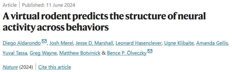 该研究以「A virtual rodent predicts the structure of neural activity across behaviors」为题,于 2024 年 6 月 11 日发布在《Nature》。