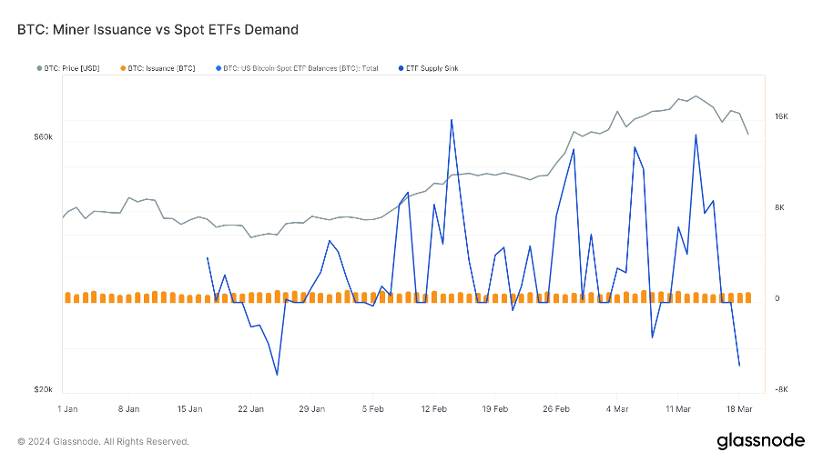 BTC这轮周期有什么不同?随着减半的临近,与ETF不断增长的需求相比,新开采并释放到流通中的BTC的影响变得越来越小。ETF从市场上撤出的数量是每天铸造的BTC数量的几倍。目前矿工每天向市场带来大约900个BTC。减半后将下降至 450个BTC,在过去的市场条件下,这可能会加剧BTC的稀缺性并推高价格。